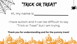 Trick or Treating is a well-known pastime most children look forward to each year. Traditionally, children happily say ‘trick or treat” as they go door to door collecting pumpkins or baskets full of goodies. This pastime can be uncomfortable and incredibly challenging for nonverbal children who have difficulty being verbal around strangers in new settings. A way to help would be to create a bag or pumpkin with a little sign and a message such as, “Nonverbal Trick or Treater – Please Be Patient.” You can purchase bags from vendors online. You can also print cards to hand out so people understand why your child may not speak to them.